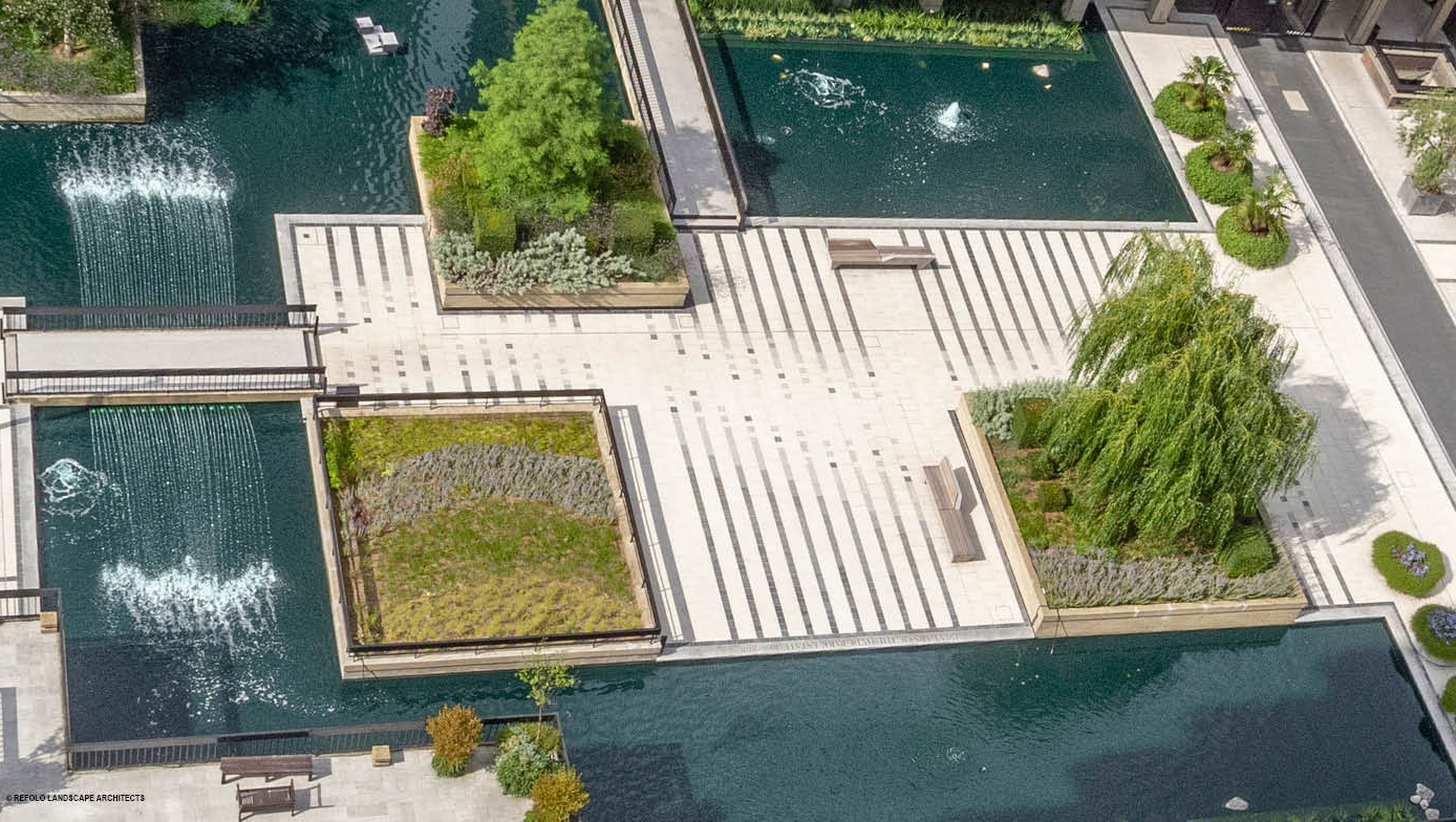 This connectivity restored together with the introduction of a rainwater harvesting irrigation system under the paving, the gardens maintain more than 33,000 new seasonal plants and 25 trees. Aquatic planting thrives in the large ponds hosting more than 400 fish. Maintenance is organic and chemical free. The Water Gardens are undeniably a unique hidden gem in Central London.