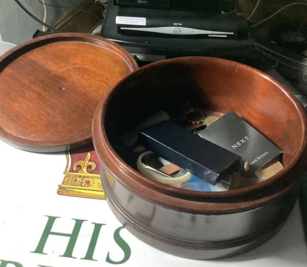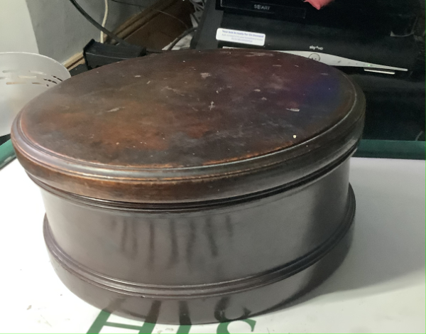 This is a nice circularbox with a push fit lid. It is difficult to tell what the wood is as it has a dark stain applied. It is probably beach or possibly pine. The condition is good and there are no cracks or obvious damage.