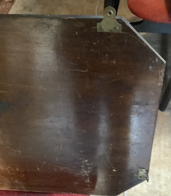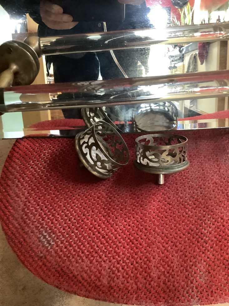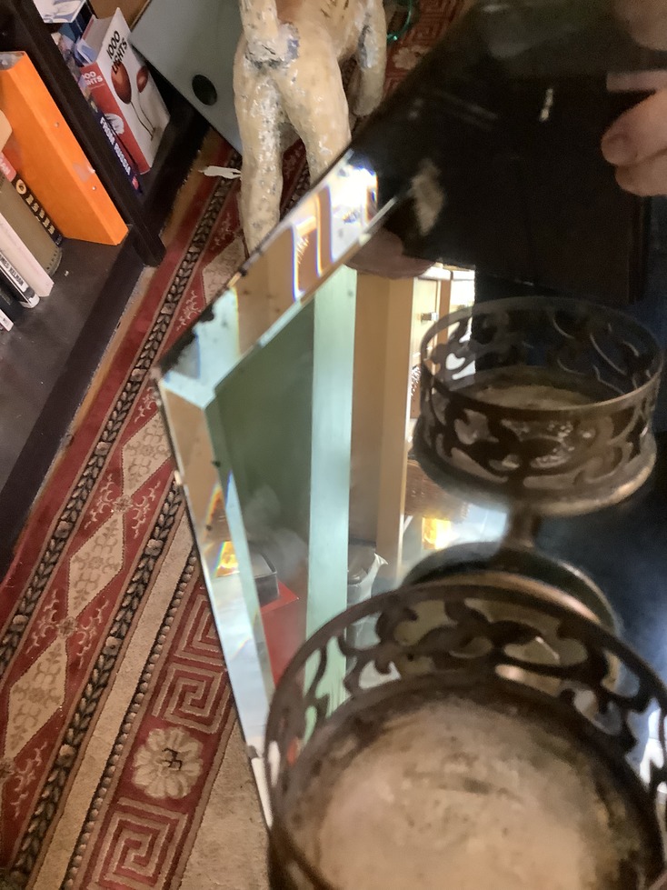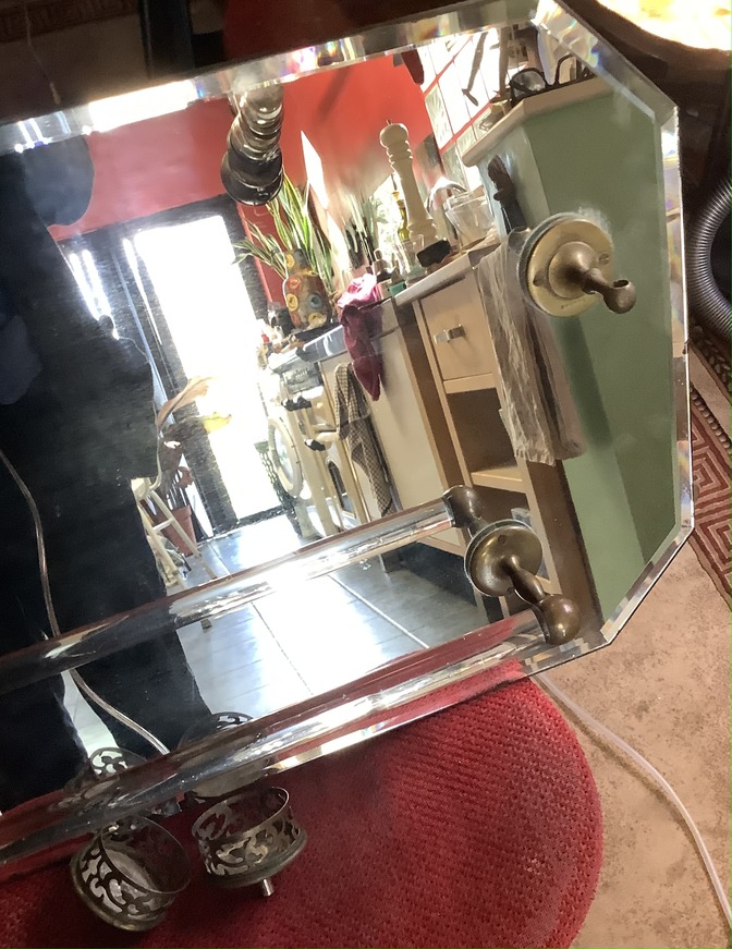 The mirror is bevel edged and squared off at each corner the brass glass holders are in heavy duty brass with a pierced lattice design They are also removablethe towel rail is made from glass and supported by two brass ends. The mirror is 28 inches wide by 18 inches tall the towel rail measures 15 inches the mirror is in good condition although there is some wear around the edges but nothing that detract from it.