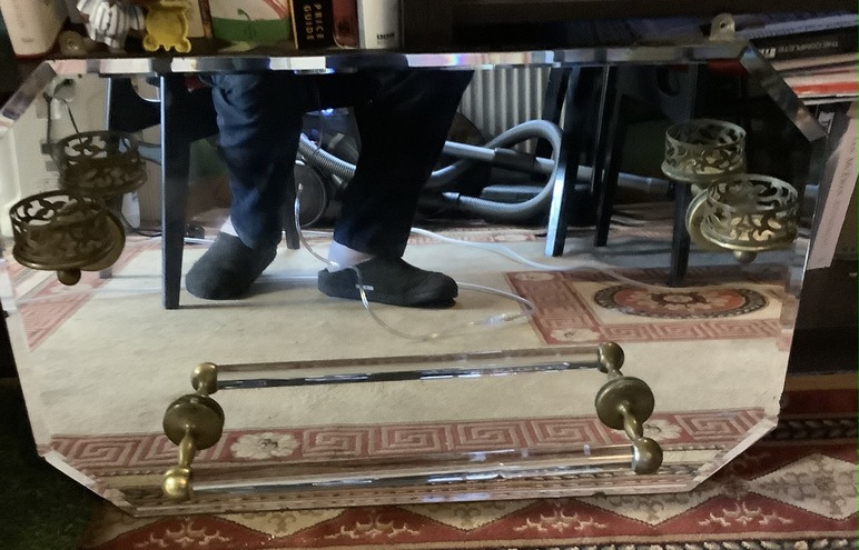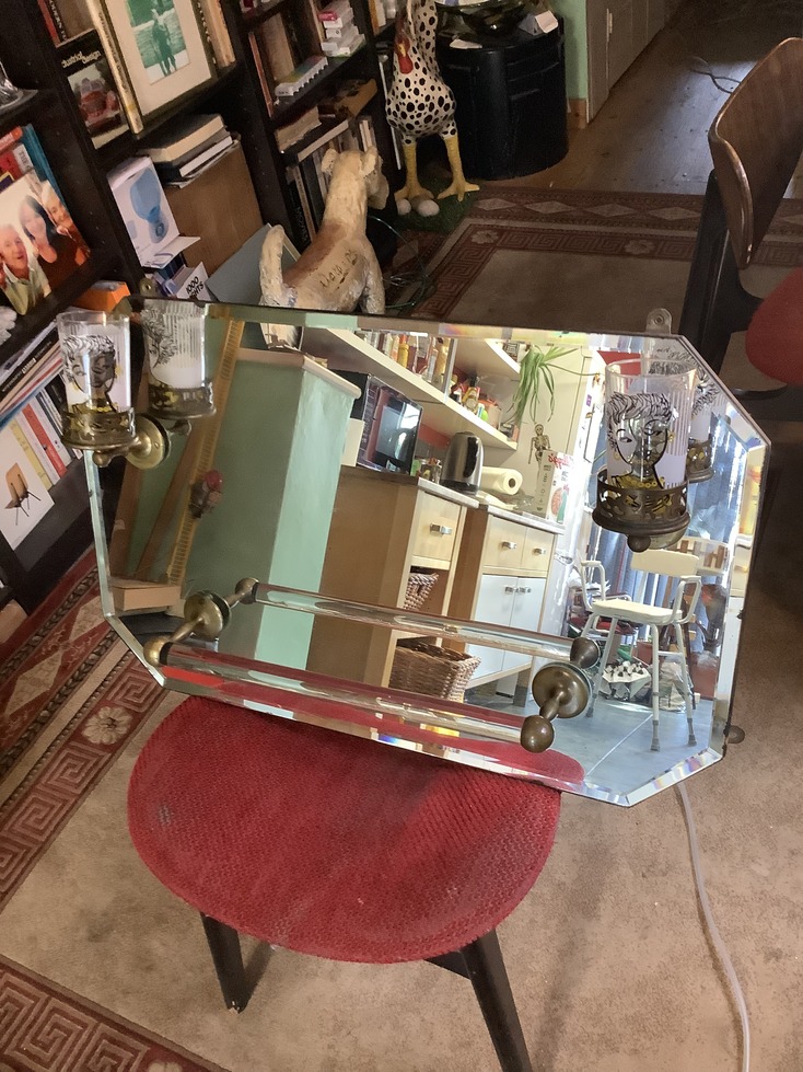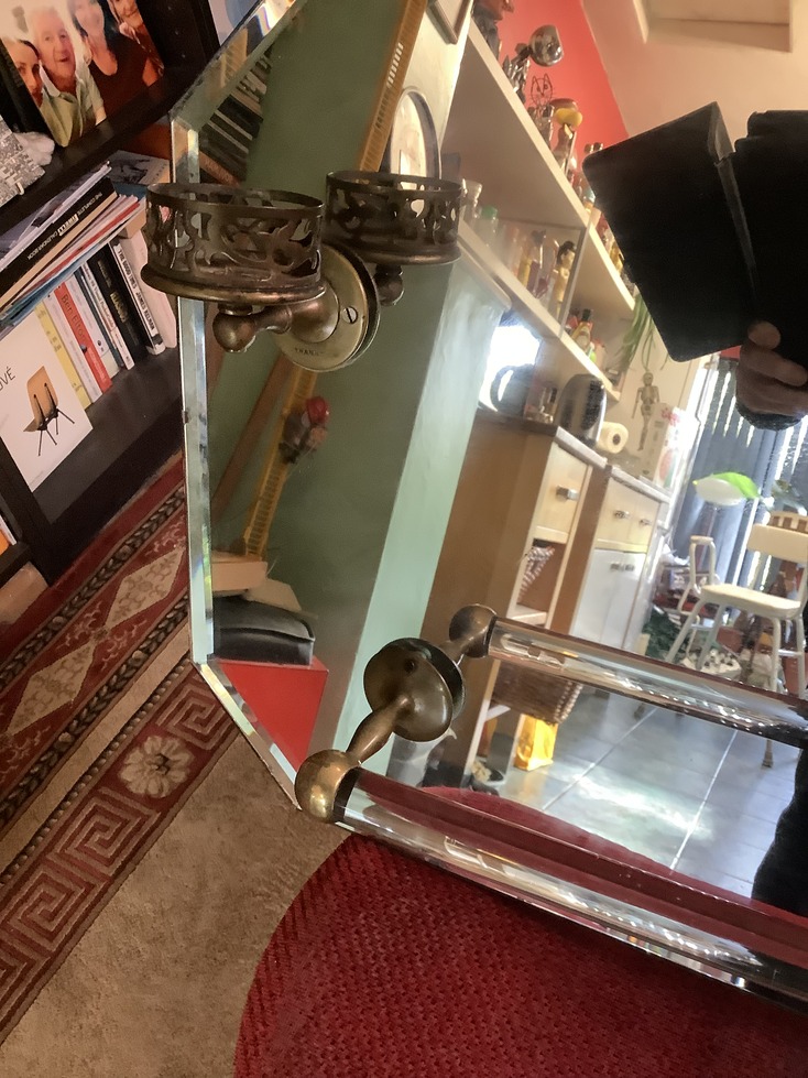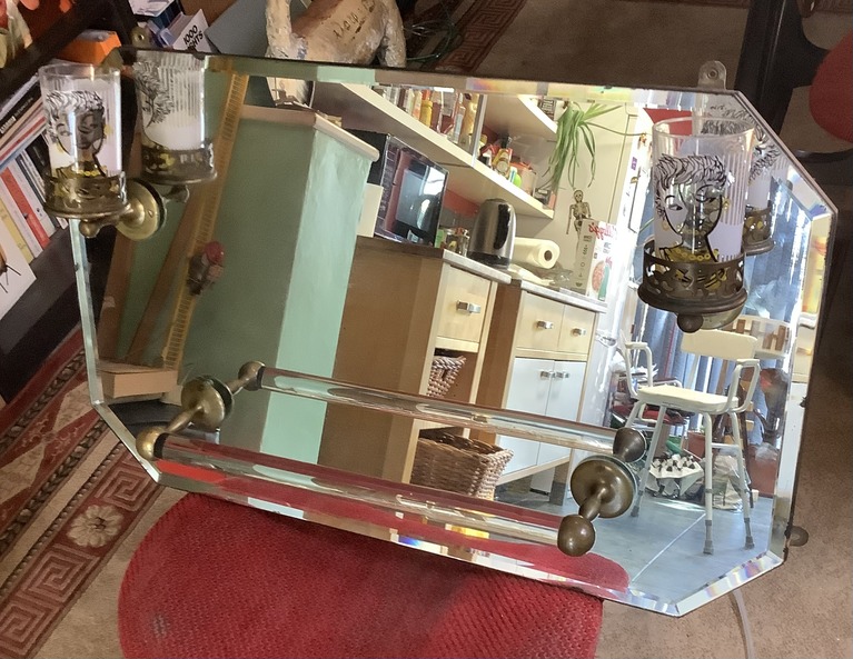 1930s bathroom mirror with brass glass holders and a glass and brass towel rail attached.