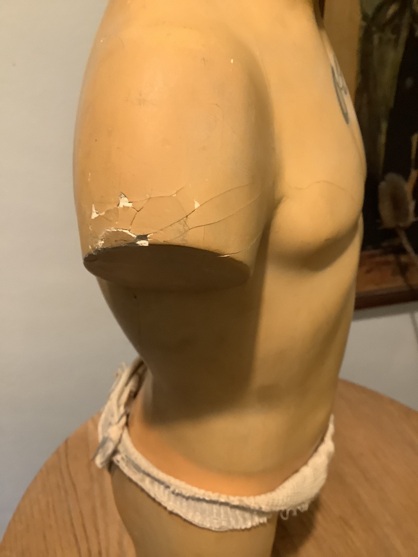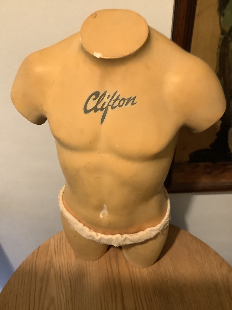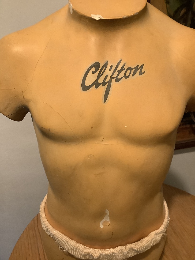 1930s countertop model advertising jockstraps or athletic supporters. The company is called Clifton. The model is a little over 2 feet tall and is basically naked except for the jockstrap. There are one or two chips on the plaster finish, however the main issue is with the right arm which has quite a few bits of chipping and greasing of the surface where it looks like it may have been dropped at some point but it is not major and I feel it does not detract from the piece.