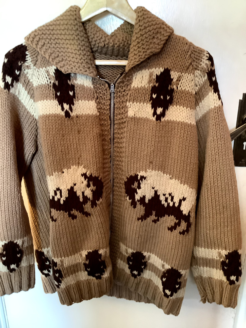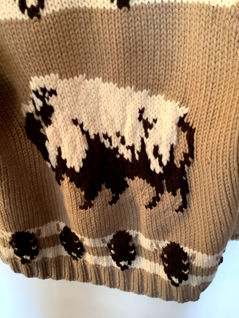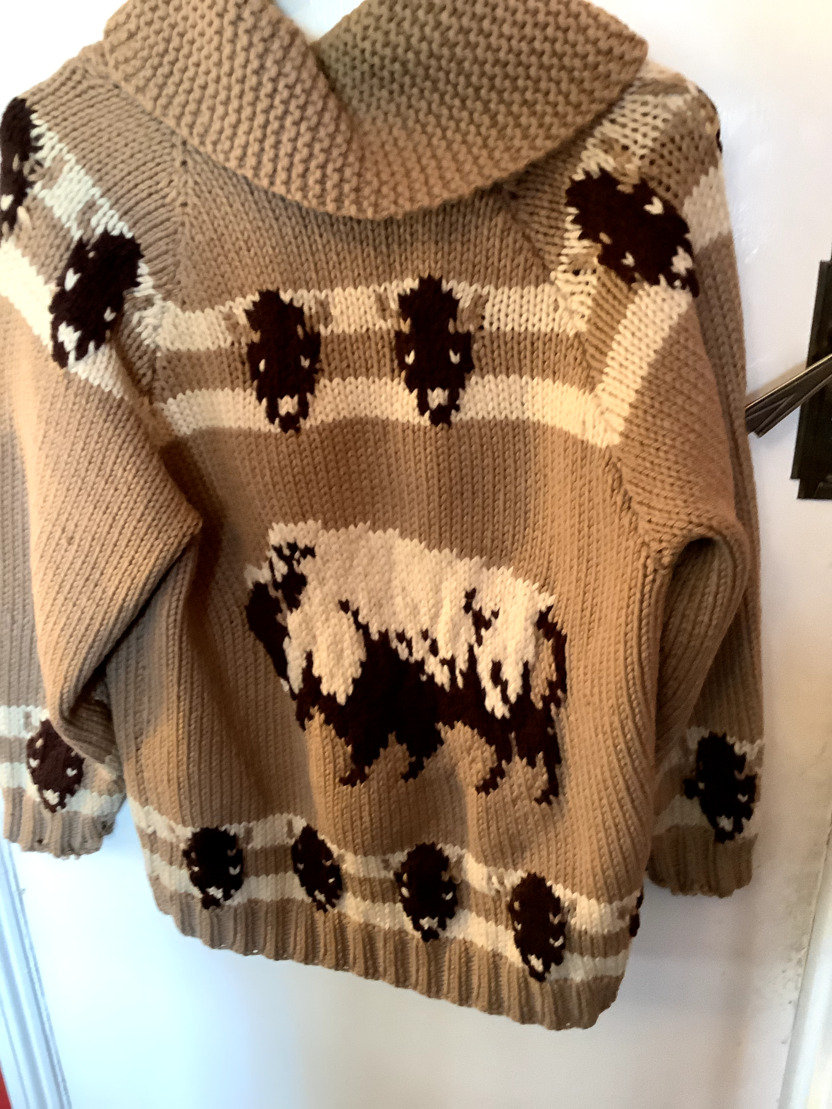 This is a home knitted large woollen cardigan in the American 50s style. It is tan in colour and has American Buffalo knitted into the design it has a front and is approximately the size 40 it is in reasonable condition for its age.