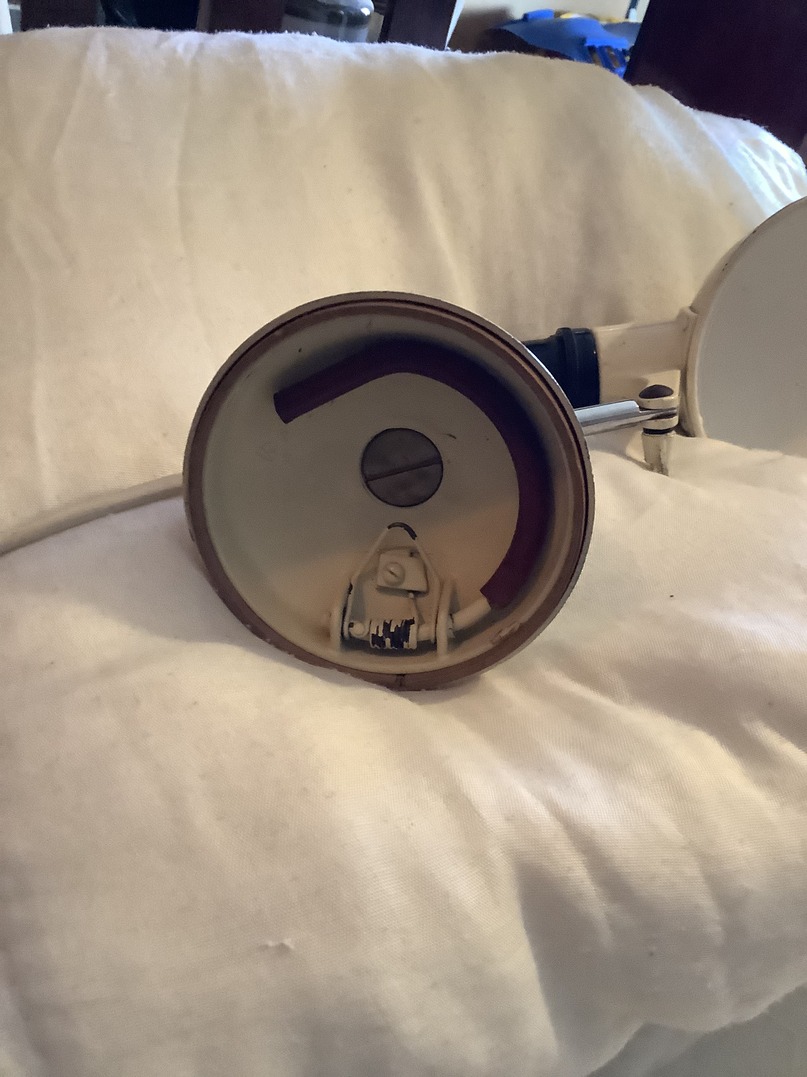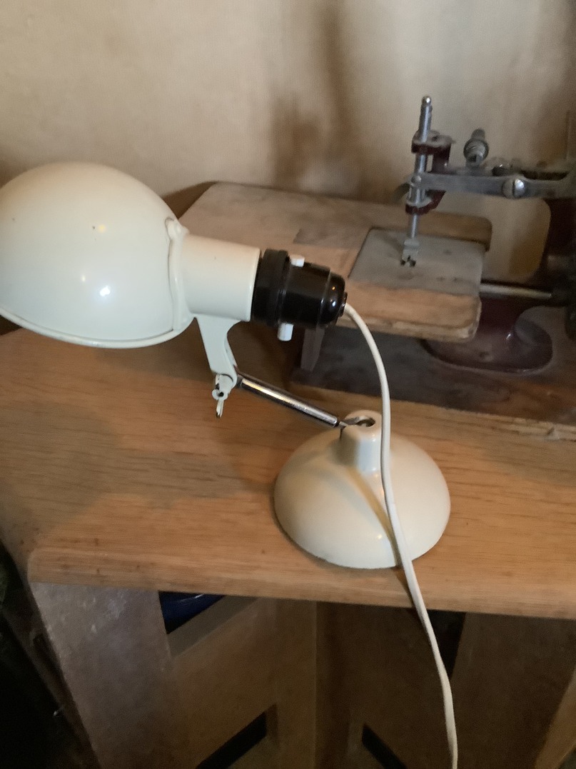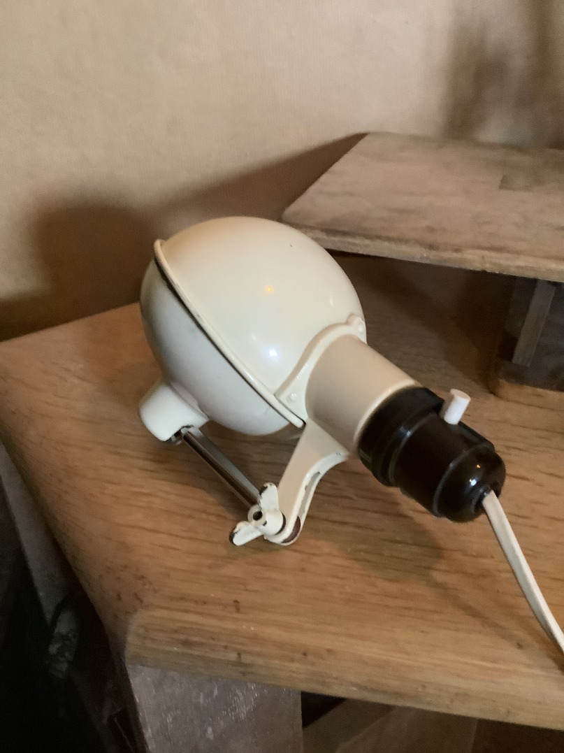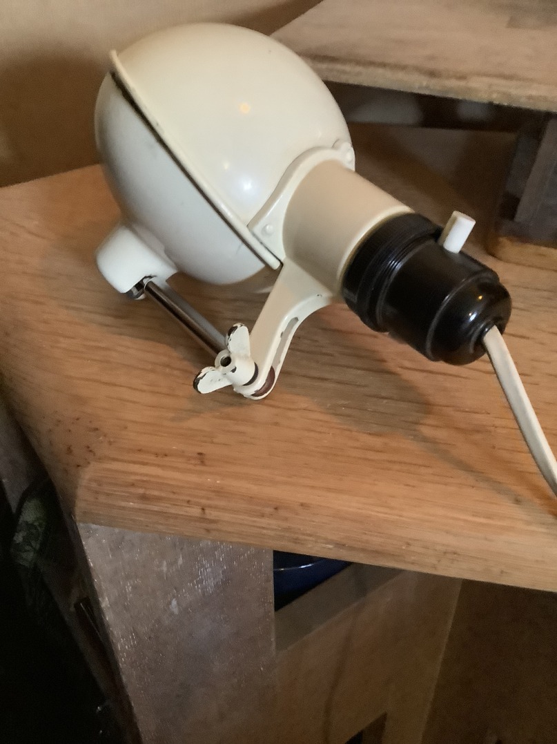 This is an original 1950s bedside lamp made to clamp onto the headboard, as can be seen by the clamp on the underside of this plate. Habitat brought out a version in the 70s which was in brushed chrome this Has the original paint work which is in excellent condition it is one tiny thing in the hood otherwise it is in excellent order.