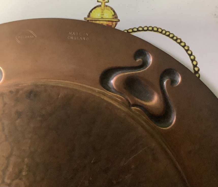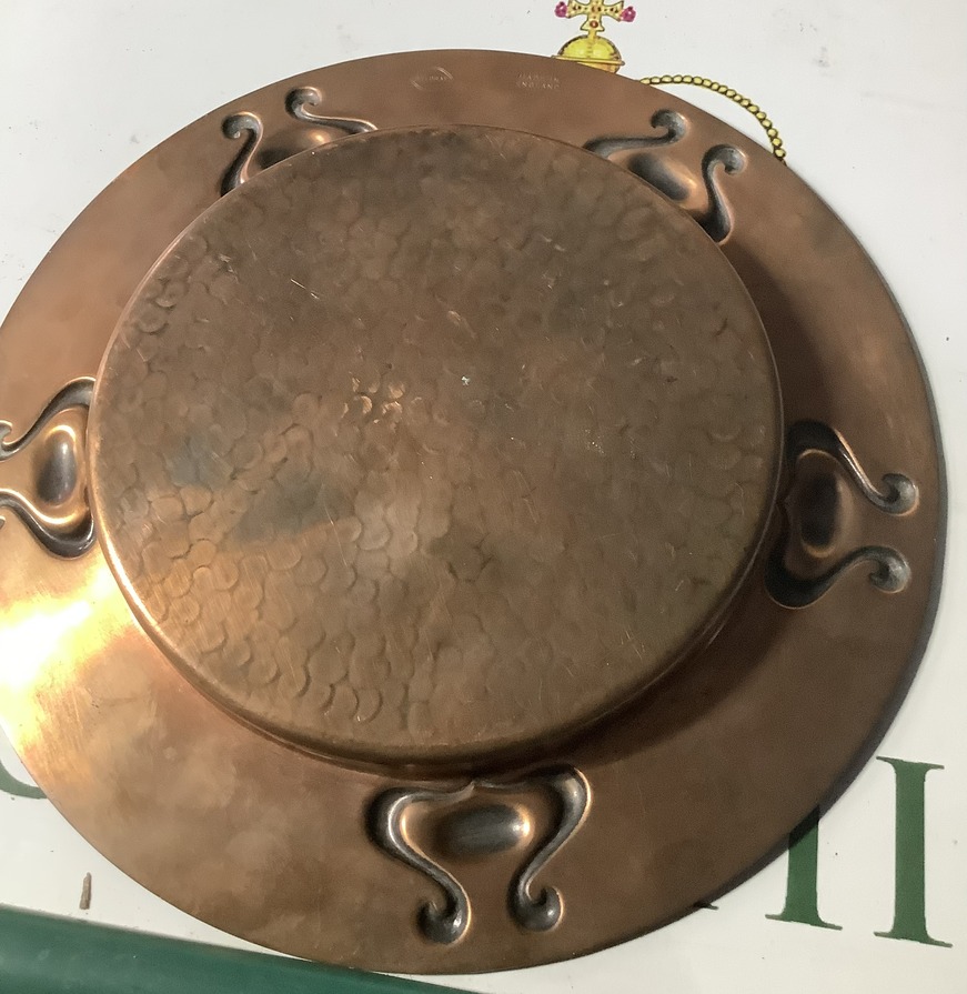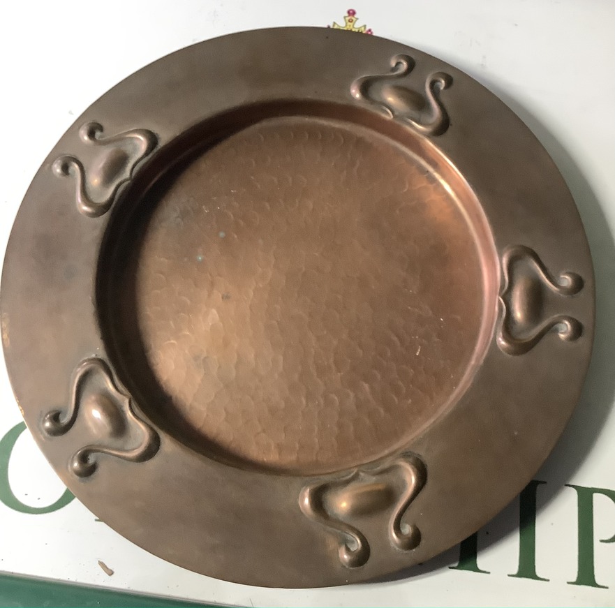 Arts and crafts copper trinket tray approximately 9 1/2 inches in diameter. This is a pretty tray and is in good condition with no dinks or dents anywhere.