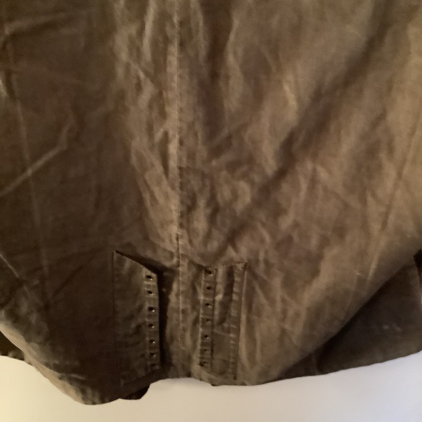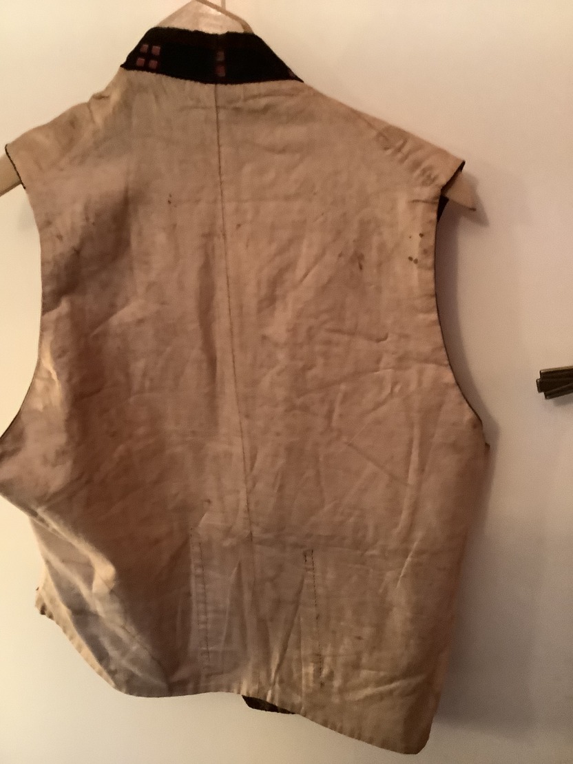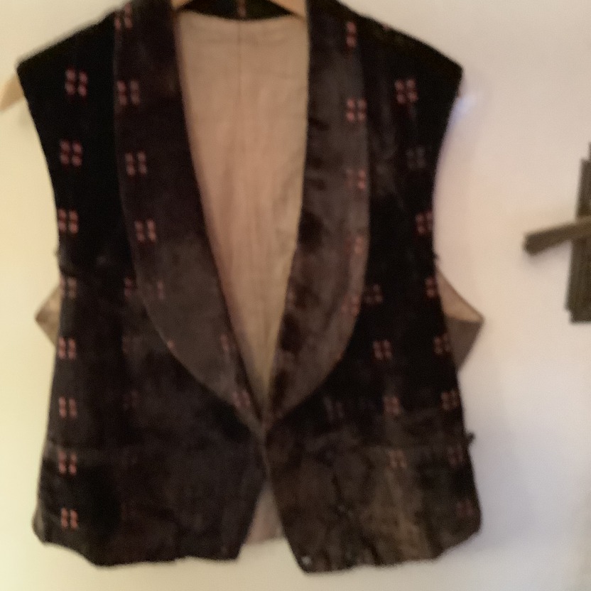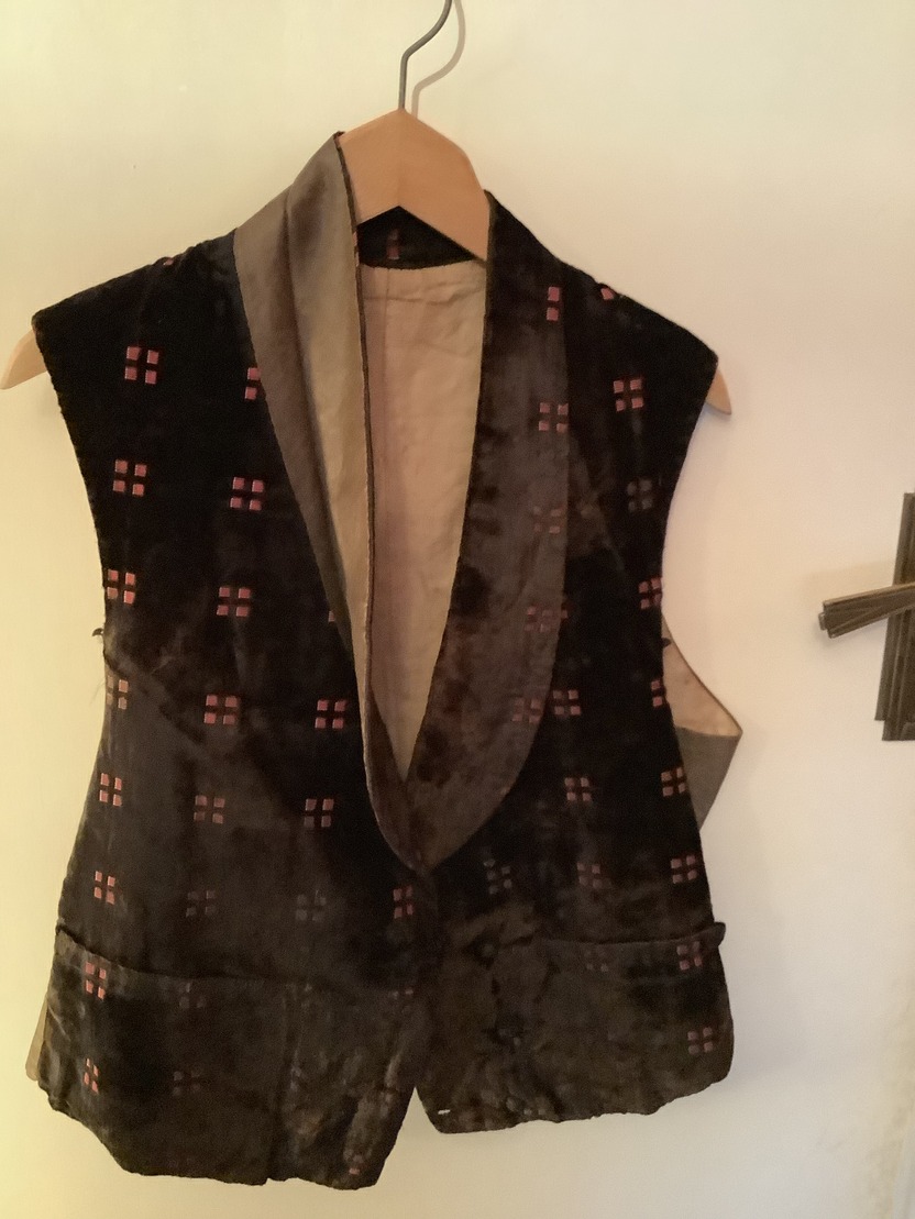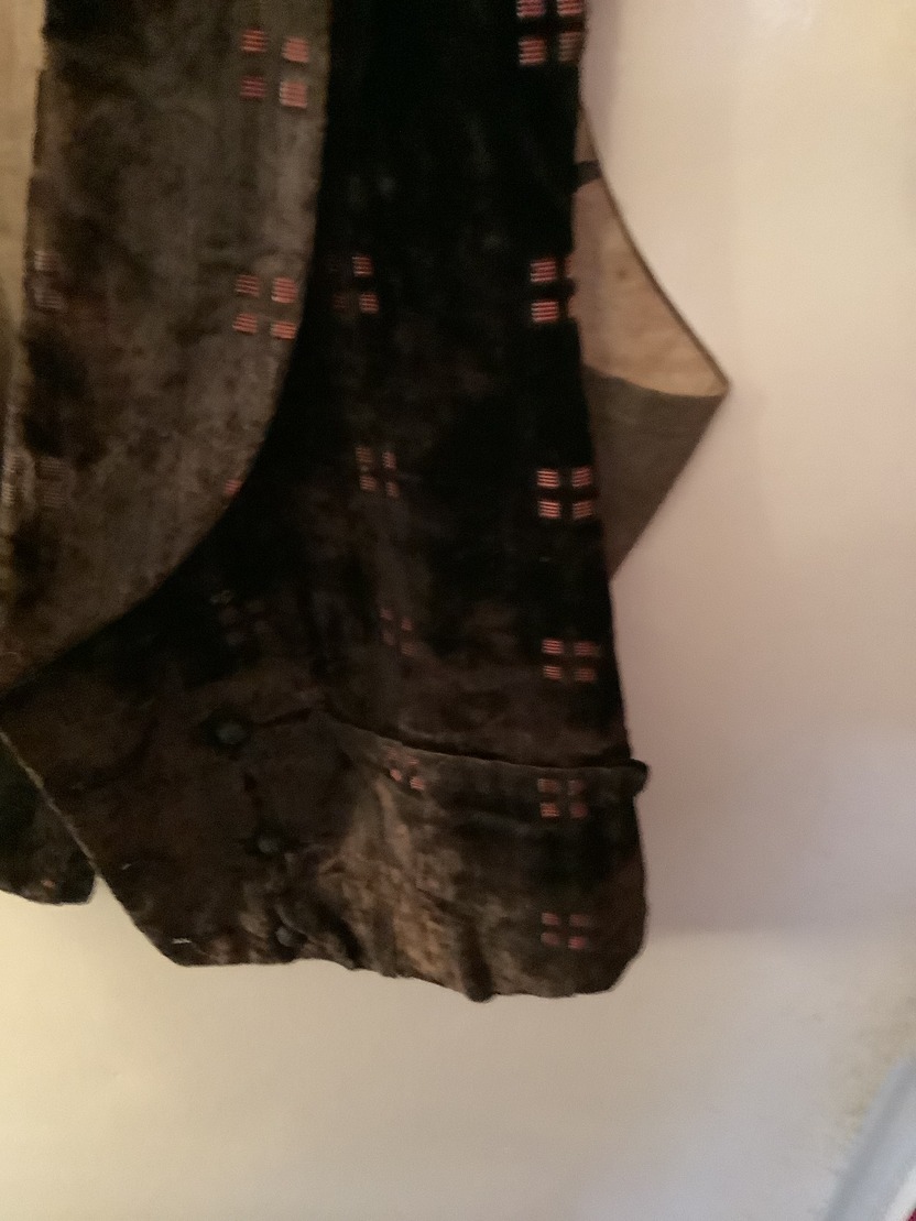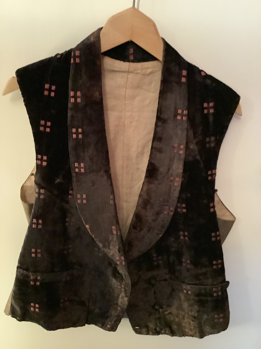 Double breasted waistcoat with shawl collar in brown velvet with a small lighter brown square chip. There are two buttons missing from the front and there is an obvious overall sign of age with this garment although it would appear to be square in good order.