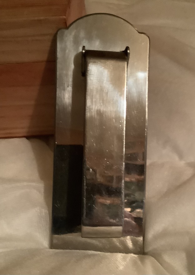 A heavy duty chrome door knocker 8 inches high by 3 inches wide and 1 inch deep. Chrome is an excellent condition for its age.