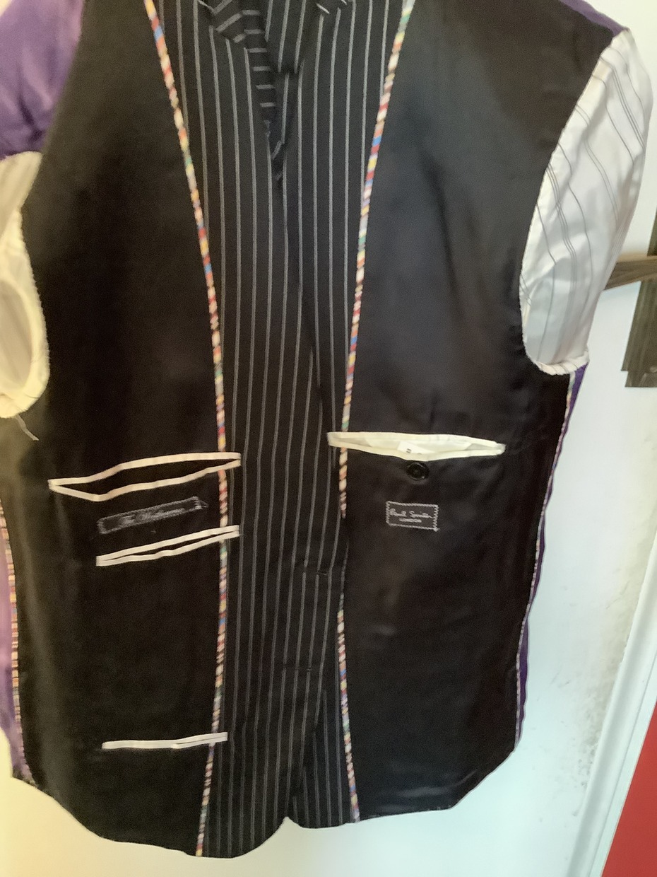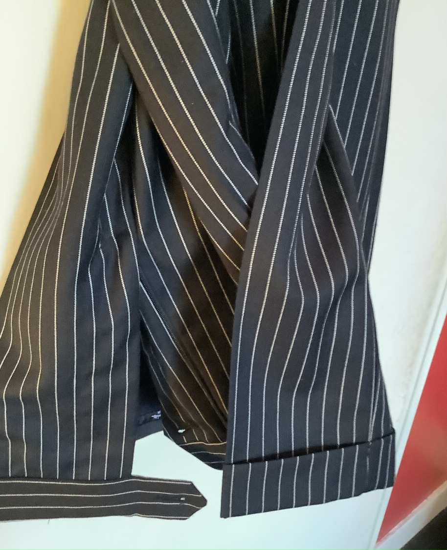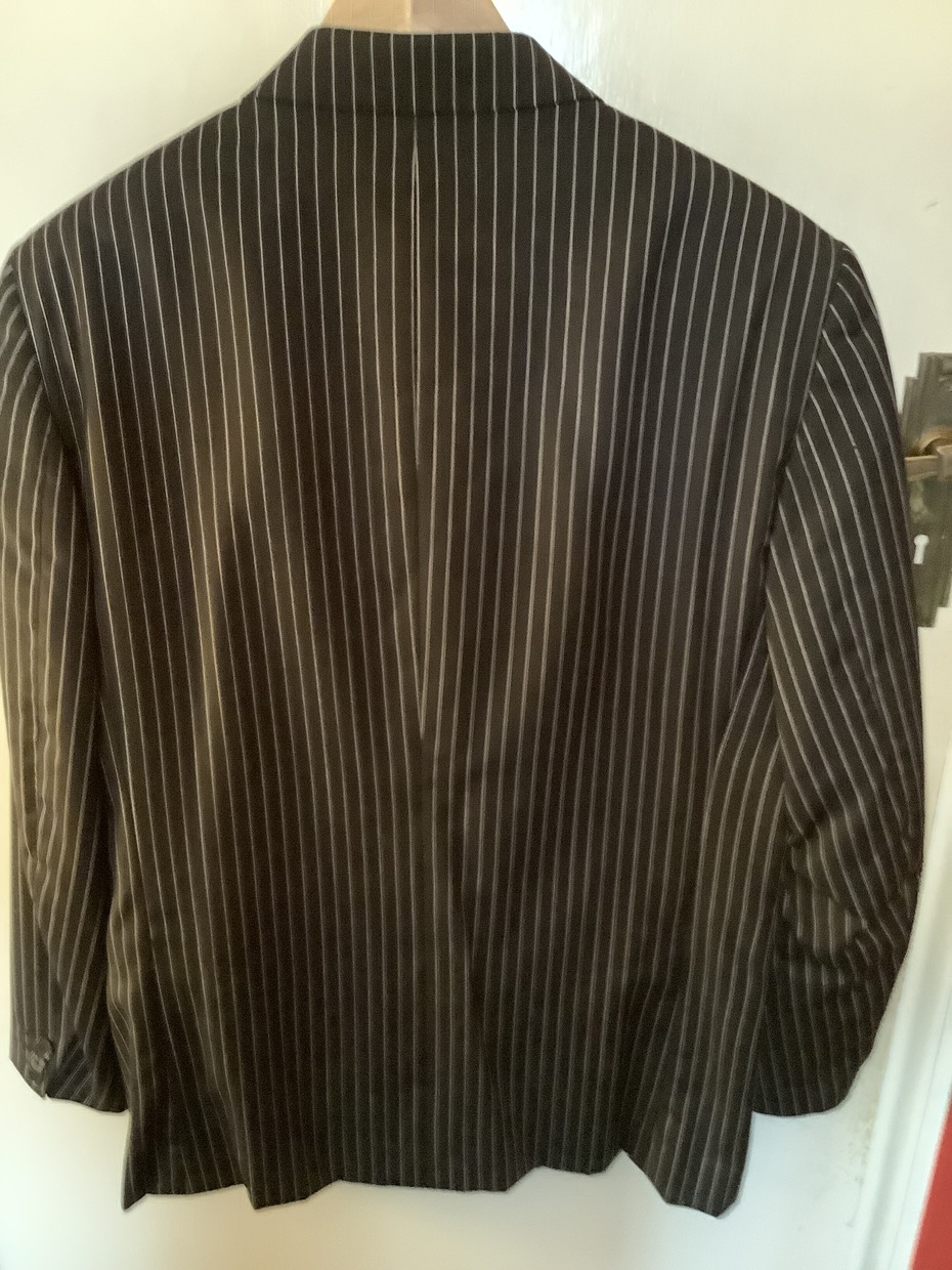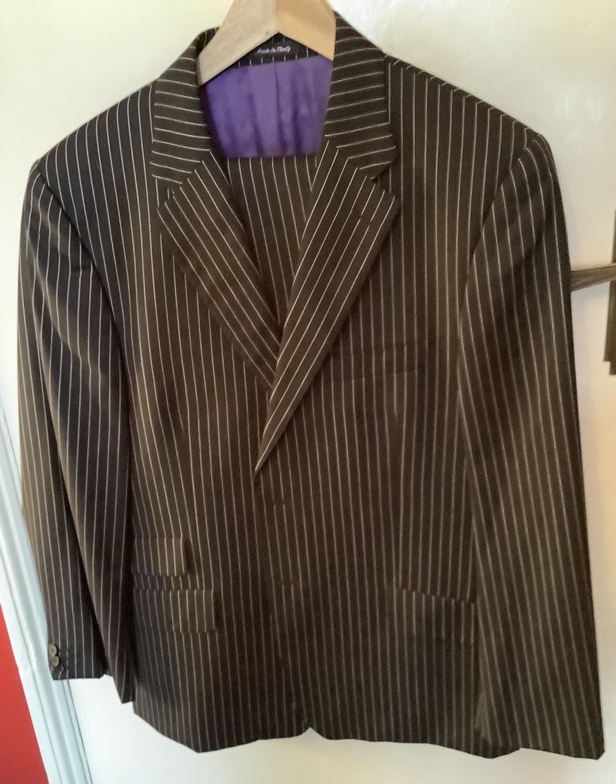 Two button single breasted pinstripe suit This suit is a size 42 waist is 32 And inside leg 29. It is in beautiful condition and there are no stains blemishes or tears anywhere to be found overall a lovely item.