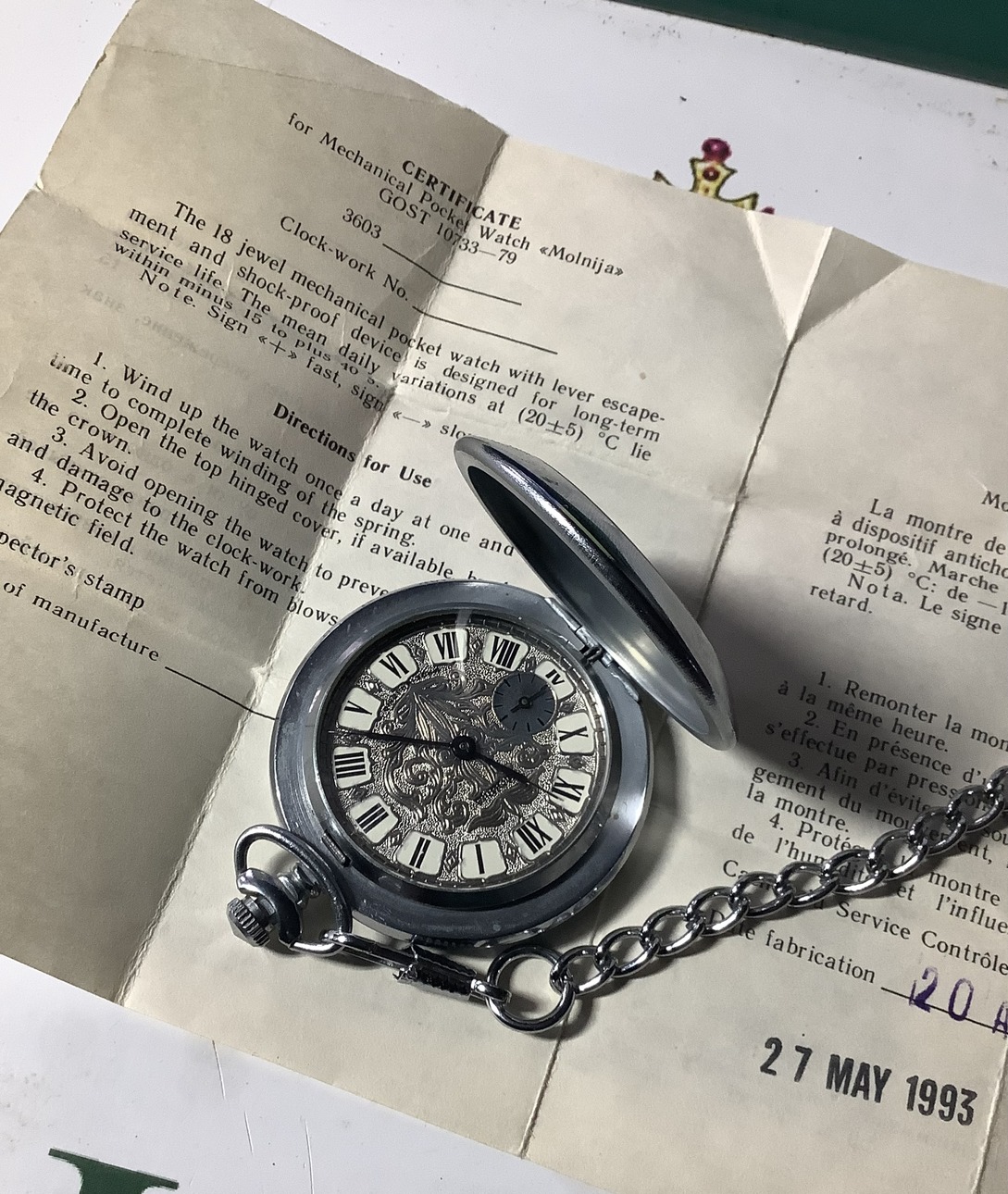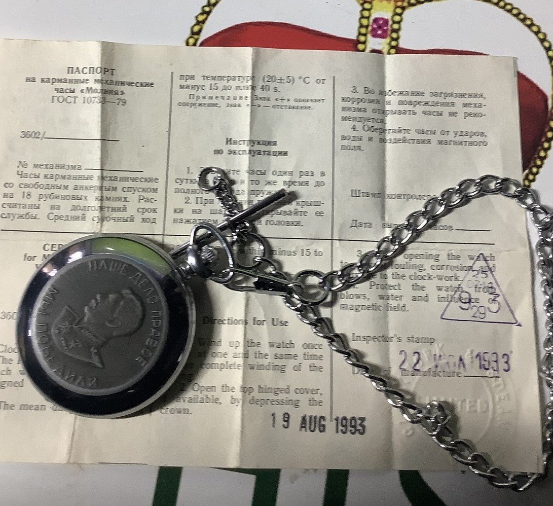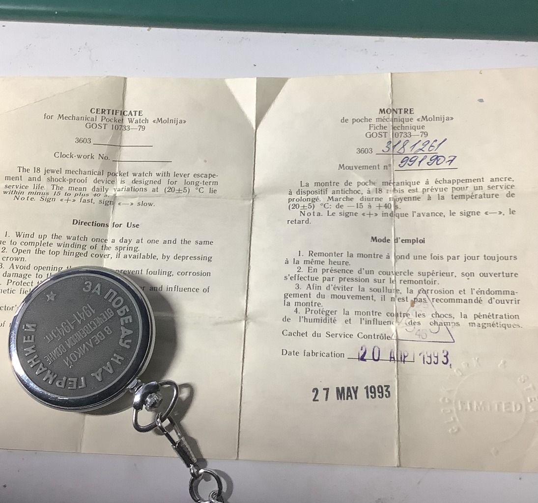 This watch commemorates Russia’s involvement in the Second World War 1941 to 1945 With Germany. Stalin’s head is embossed on the front cover of the watch with the words “Our cause is just we won” On the back It states “We won for victory the great patriotic war 1941–1945”. The guarantee which has run out is dated 1993 so the watch is just over 30 years old. It works very well and is in lovely condition as it has been kept in the box all its life.