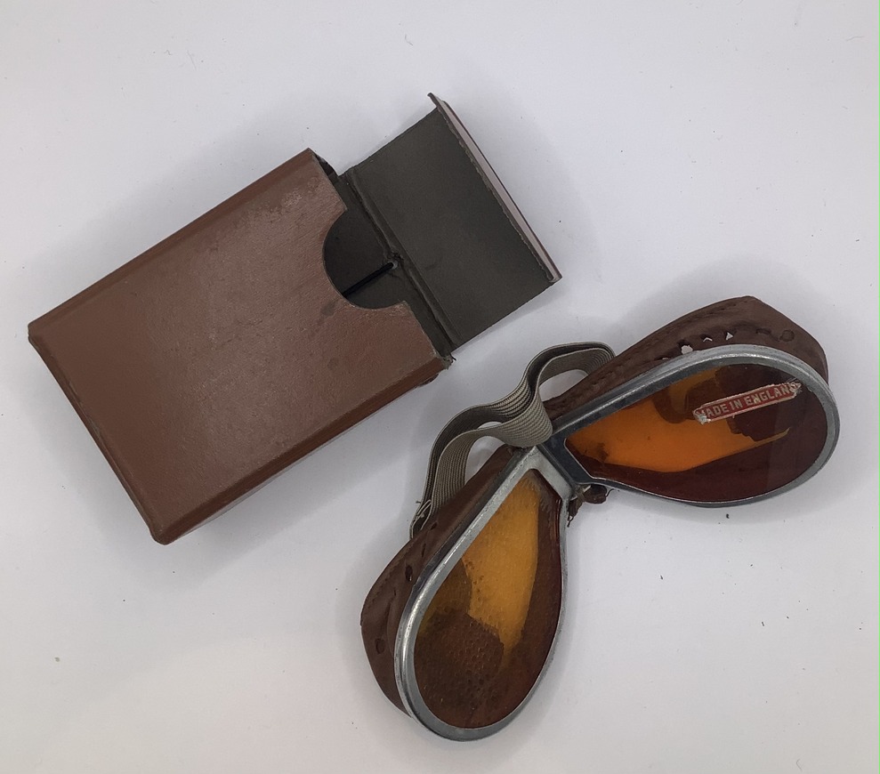 These goggles have a brown tint in the glass and come in their own small carrying case, probably around 1940s possibly earlier.