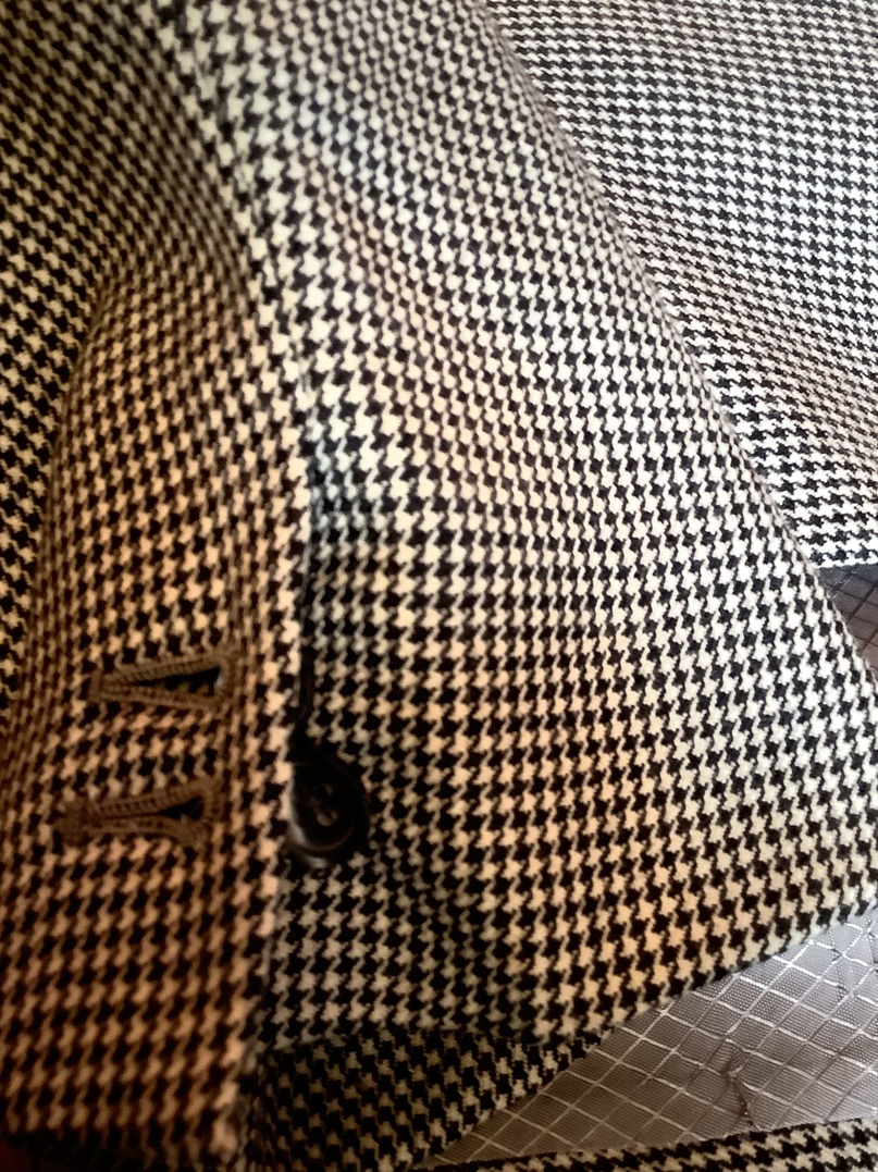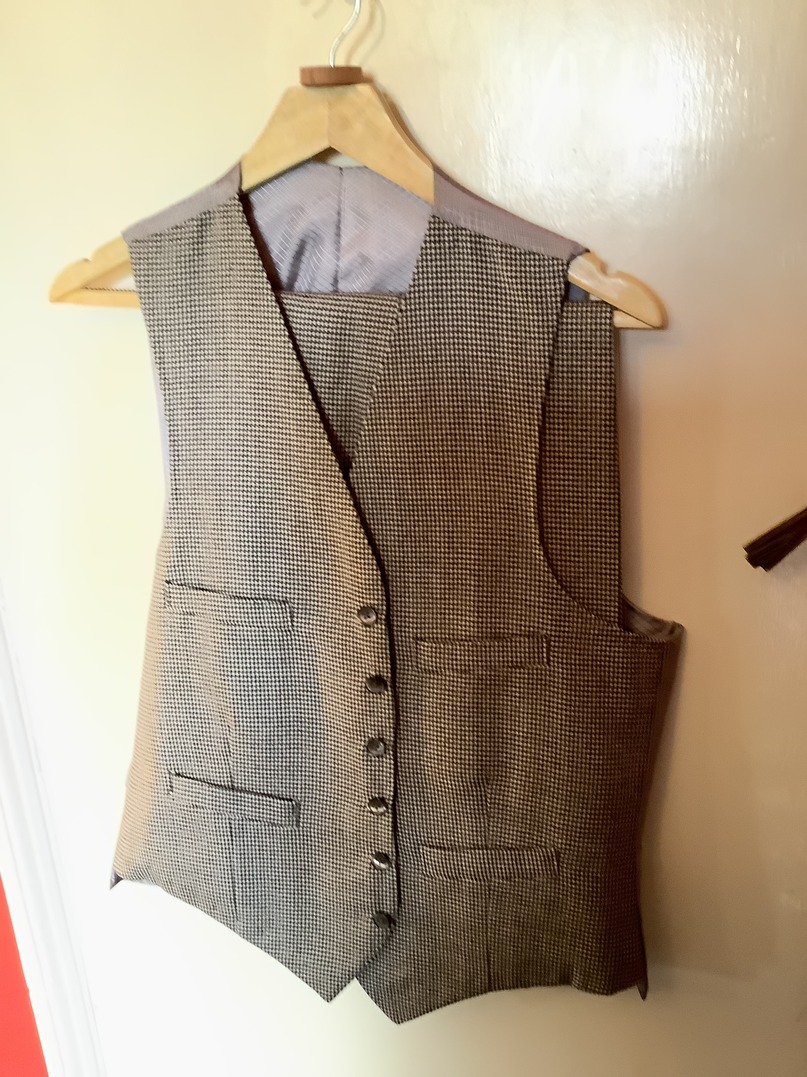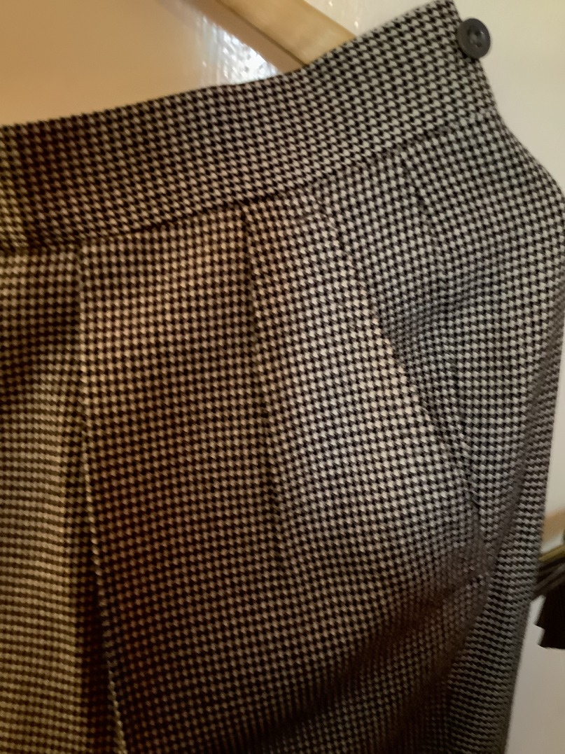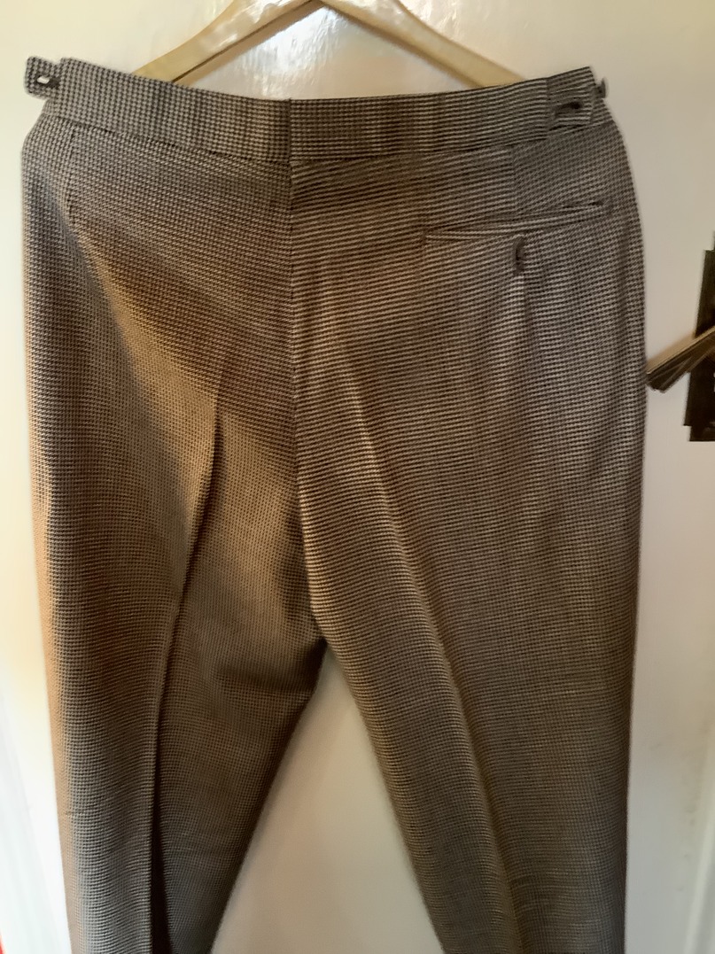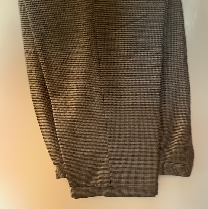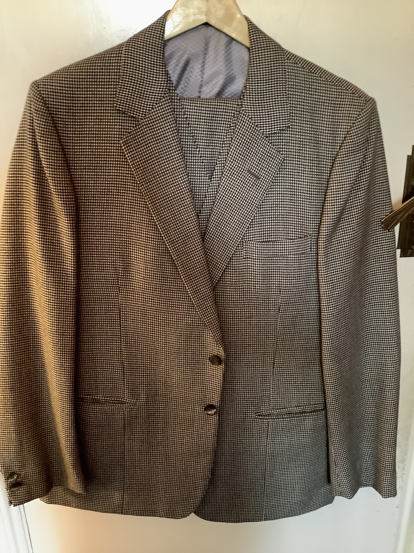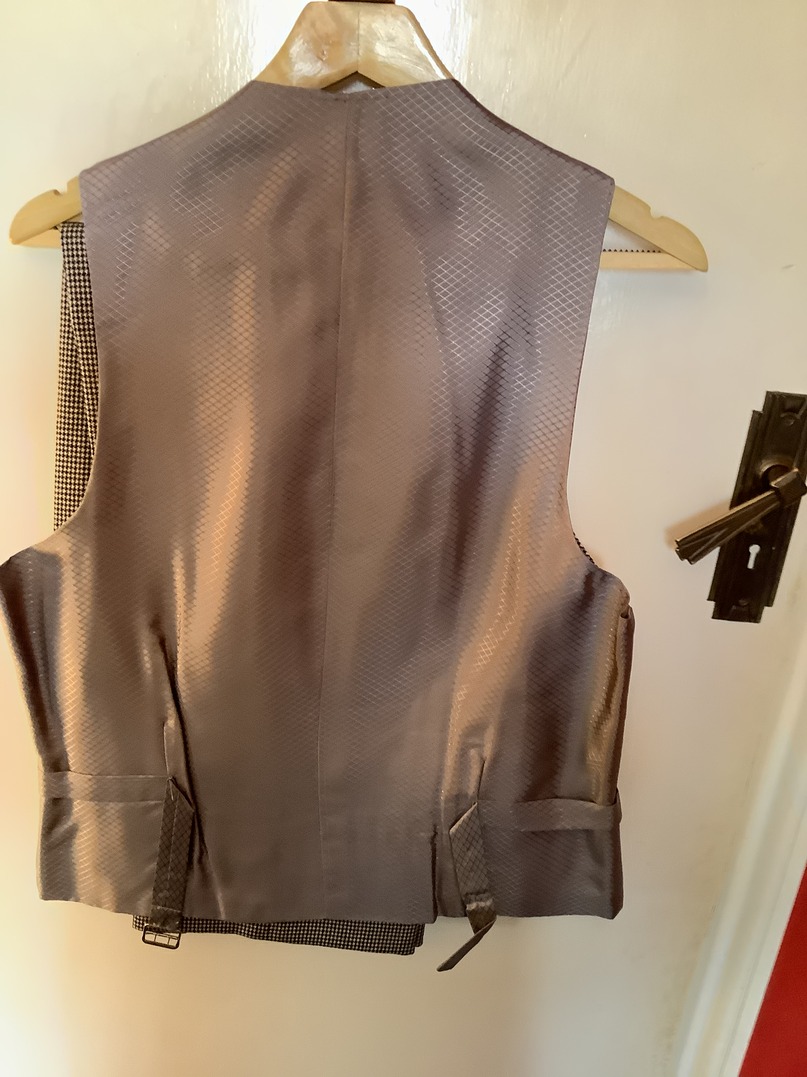 This bespoke suit is in grey and white dog tooth material. It is a single breasted two button single vent jacket. The trousers are pleated in the front and have turn ups to the legs. The waistcoat has four pockets. The suit is in excellent condition with little wear and there is no damage that I can find. It is extremely clean in condition. The inside leg measures 29 inches and outside 40